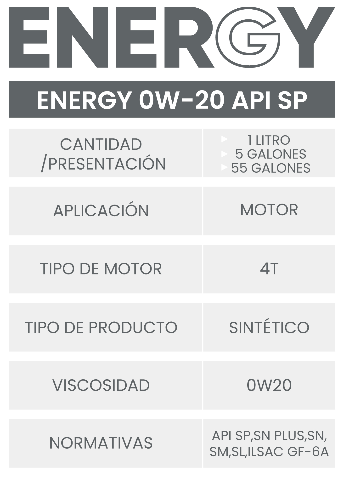 Aplicaciones y Especificaciones : API SP, SN PLUS, SN, SM, SL – ILSAC GF-6A OW-20 oil is required.